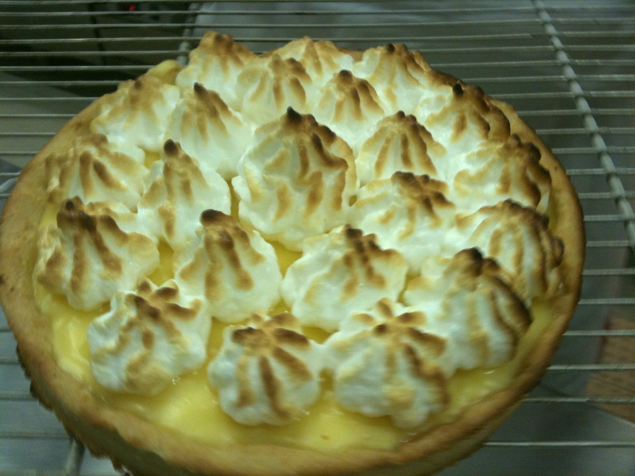 Battre les bancs d’œuf. Quand ils sont montés au 2/3 ajouter le sucre en poudre et terminer de battre les œufs. Mettre les blancs d’oeufs battus sur la tarte à l’aide d’une poche à douille, passer quelques minutes à four très chaud: