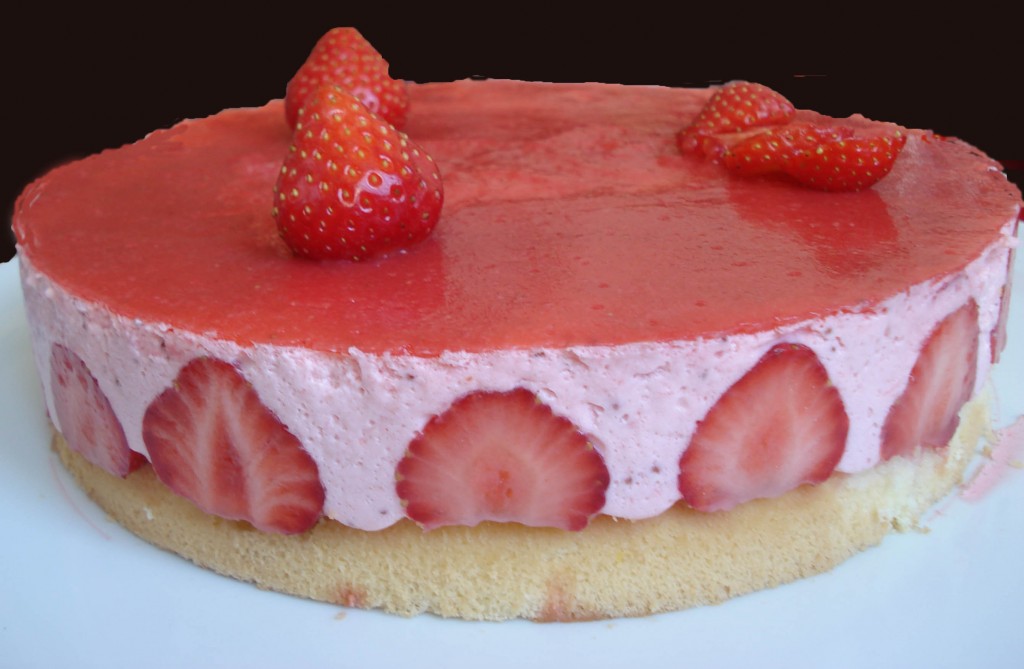 La recette dans les grandes lignes: un fond en génoise, une mousse constituée de fraises mixées, de crème fouettée, sucre et gélatine. Pour le glaçage: fraises mixées et gélatine.