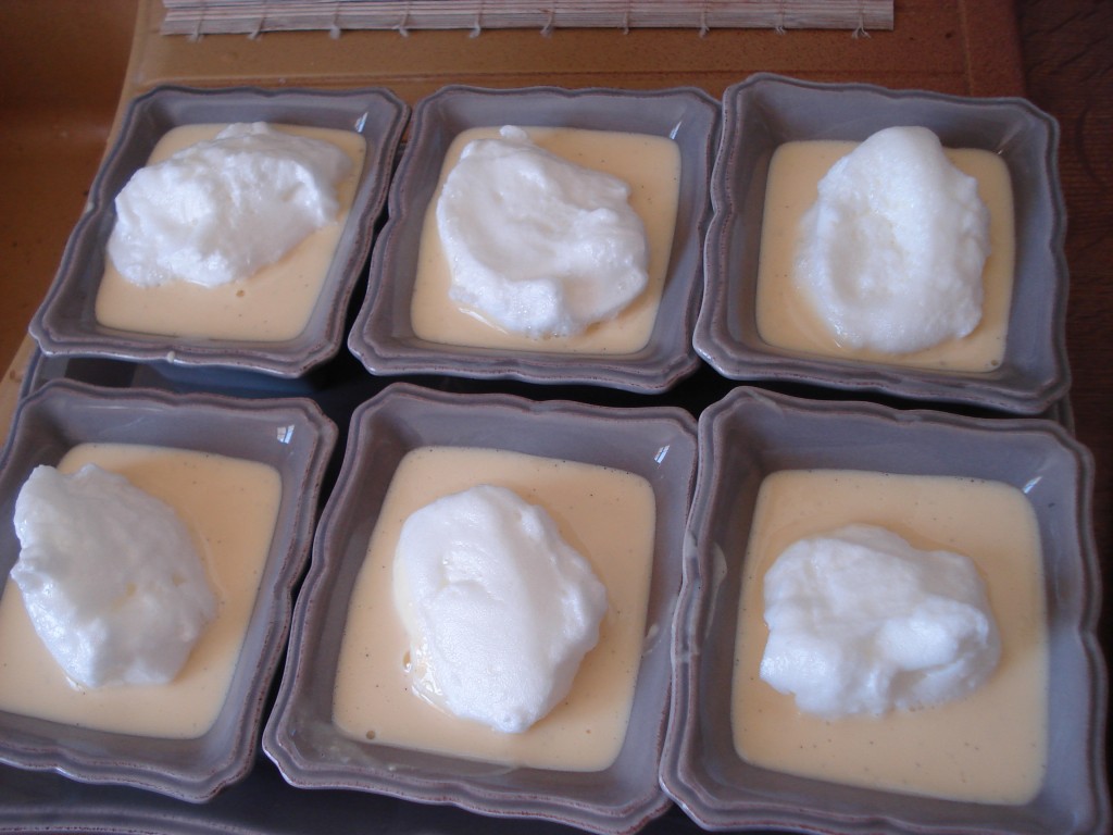 La recette dans les grandes lignes: une crème anglaise (maison et réussie,ouf sinon c’était la honte), des blancs d’oeufs en neige, légèrement sucrés et pochés dans un mélange de lait et d’eau (la recette du CAP!).