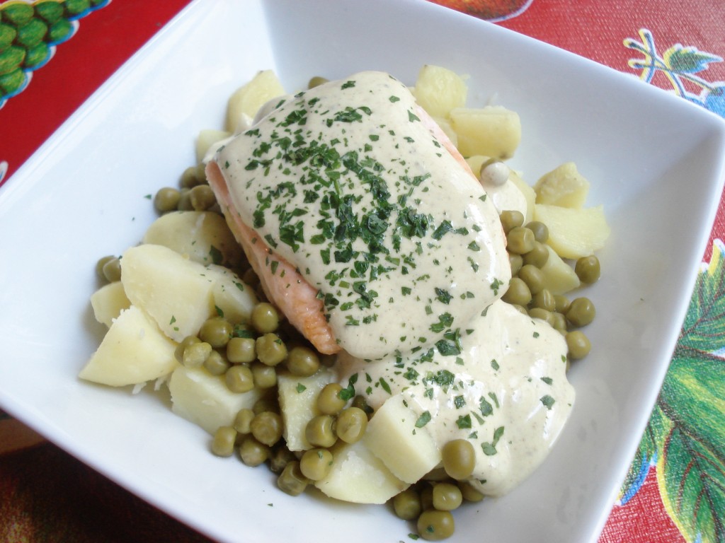 Saumon au Boursin Curry Thaï, pommes de terre et petits pois.
