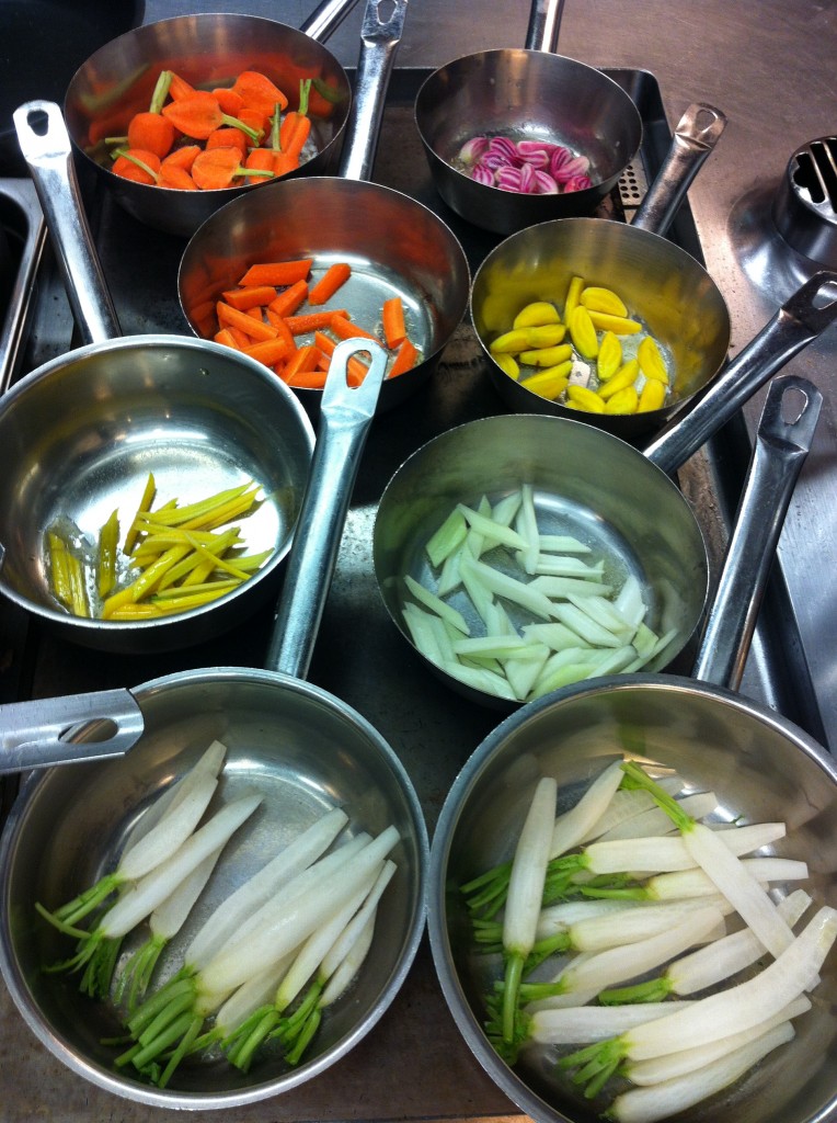 La technique (expliquée par le sous chef Cédric) : faire revenir rapidement les légumes dans du beurre sans les colorer. Saler. Ajouter une petite louche de bouillon à feu très fort et couvrir avec une assiette. Le bouillon se transforme rapidement en vapeur (il ne faut donc pas en mettre trop sinon ça fait des légumes bouillis) et ça cuit très vite. La difficulté : jongler avec toutes les casseroles et cuire parfaitement chaque légume !