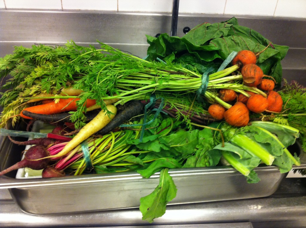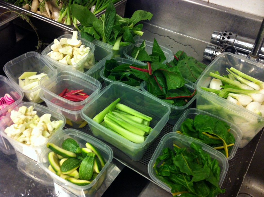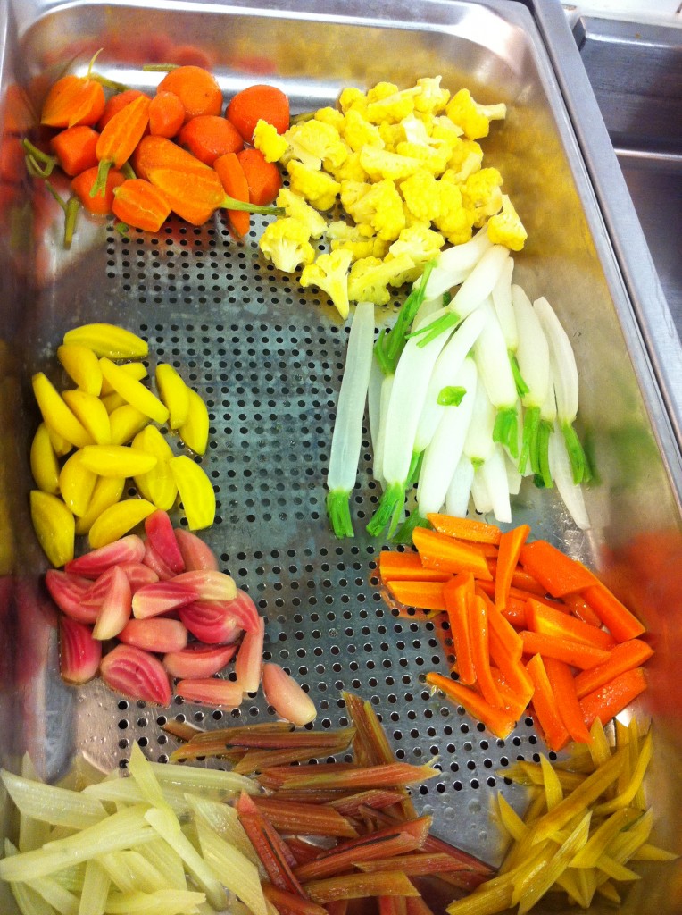 9h15 : en tenue, ma mission : aider le sous-chef, Cédric, à préparer la salade de légumes de Joël Thiébault (la star des maraîchers, un aperçu ici)