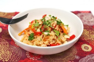 Riz sauté au saumon, poivron et carotte cuisiné
