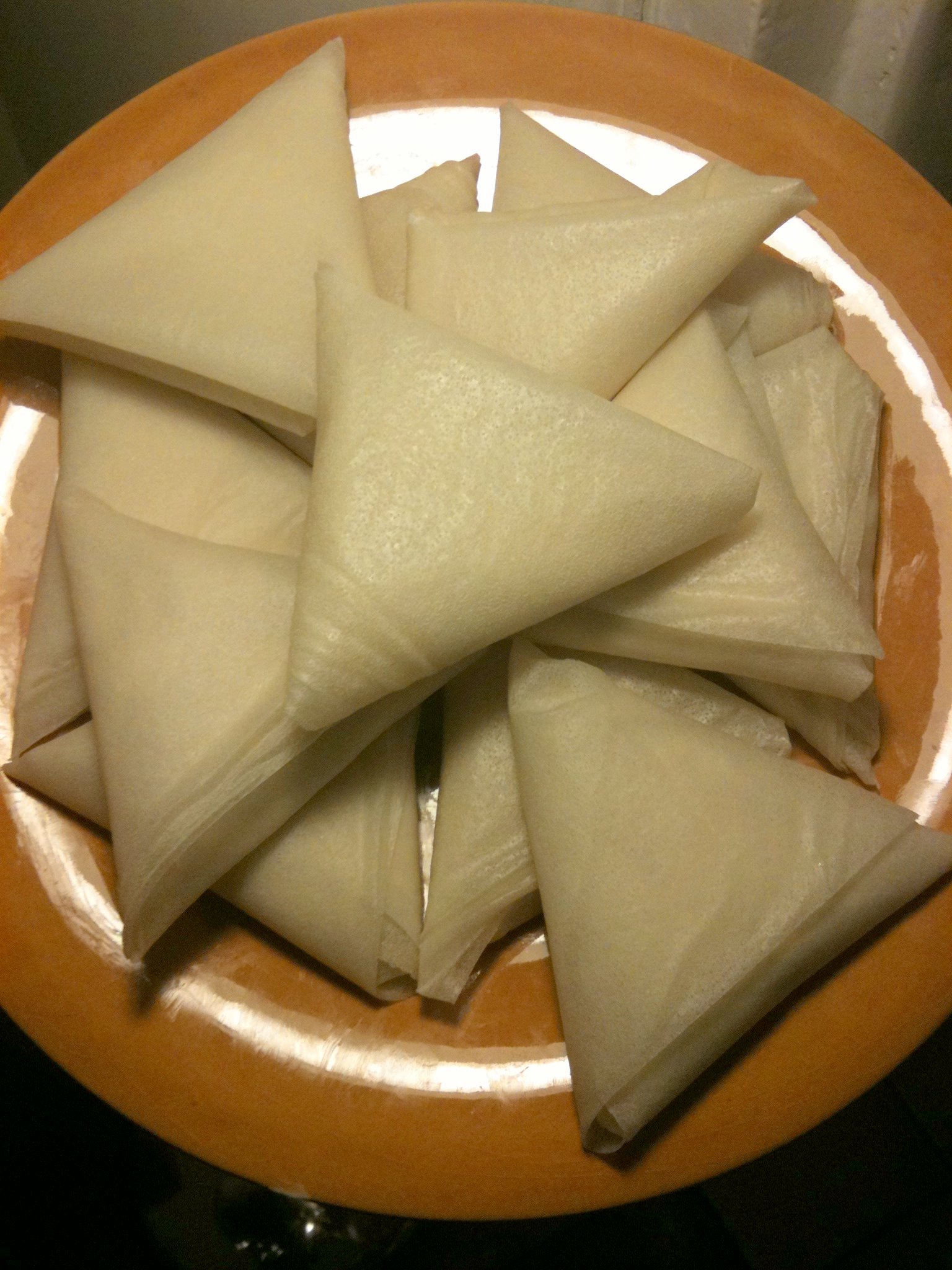 Replier ensuite les côtés puis rouler la brick pour obtenir un rectangle. Déposer sur un papier sulfurisé, le côté plié en dessous. Renouveler l’opération pour chaque brick.